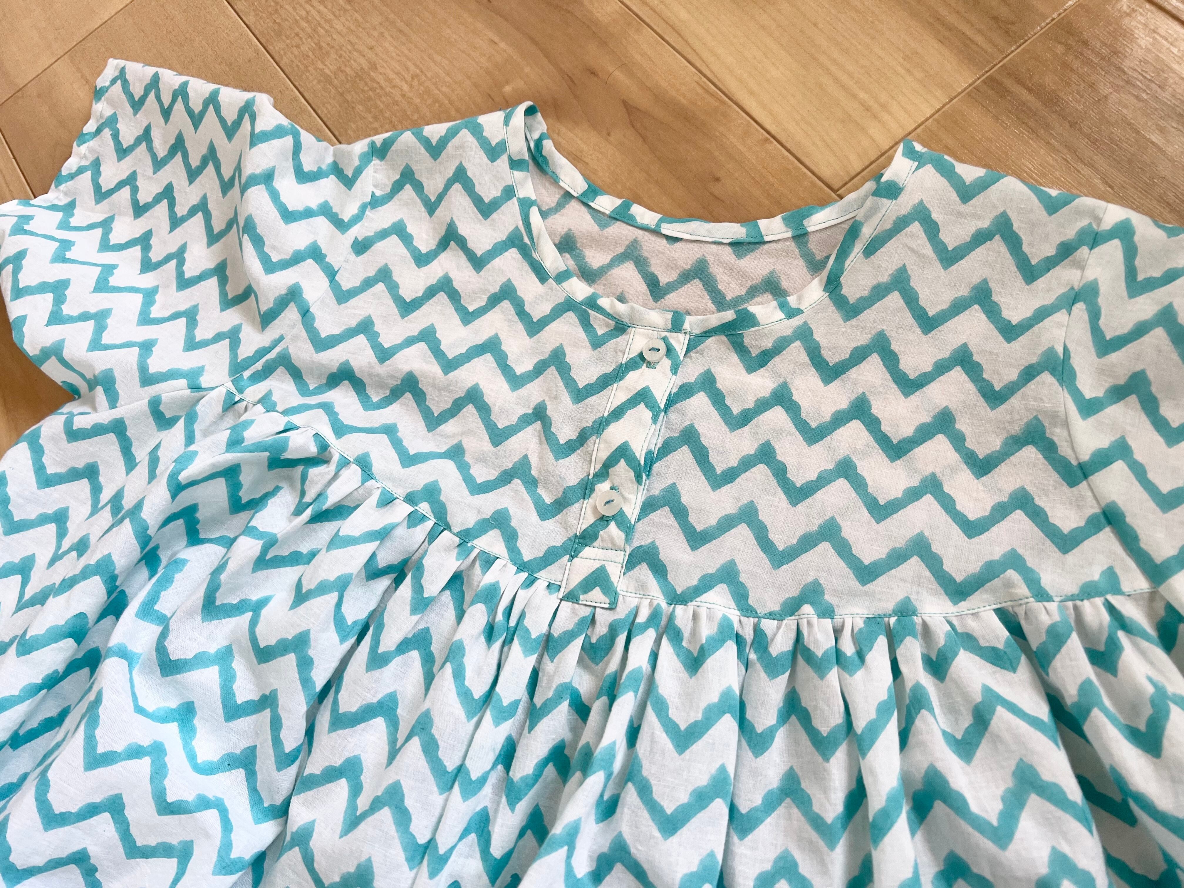 インドの室内着 ナイティ インド綿ブロックプリント(水色ボーダー)