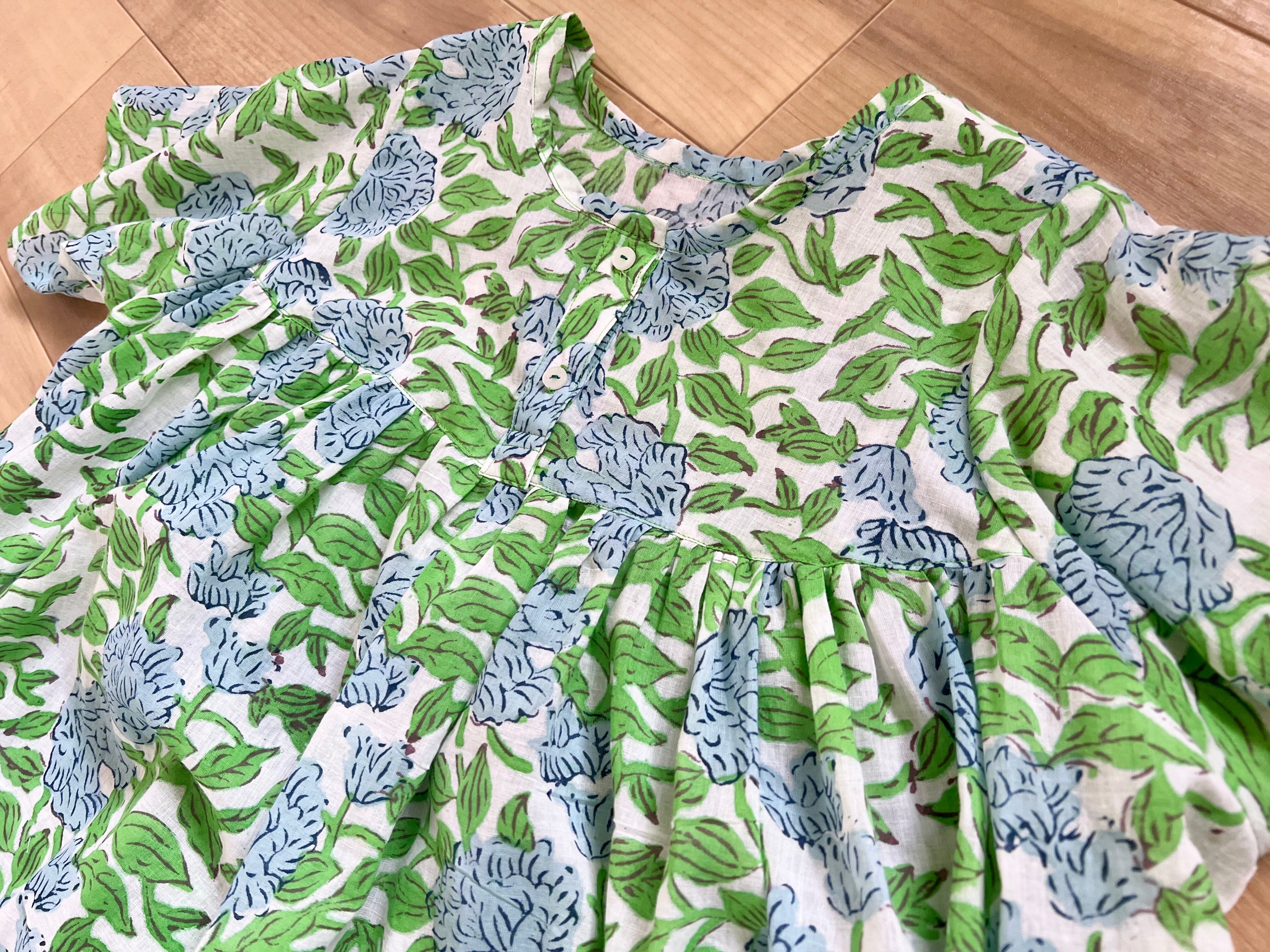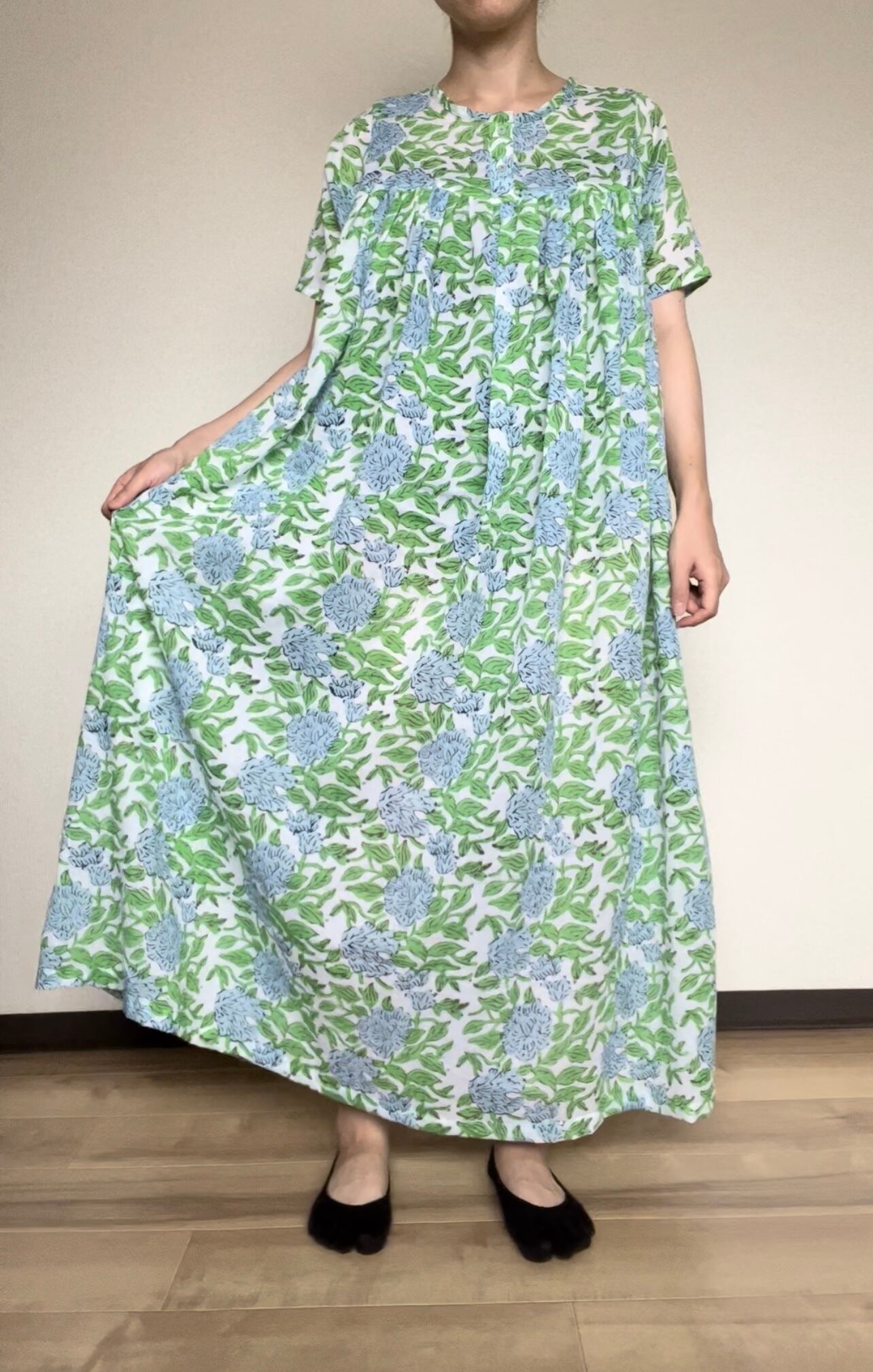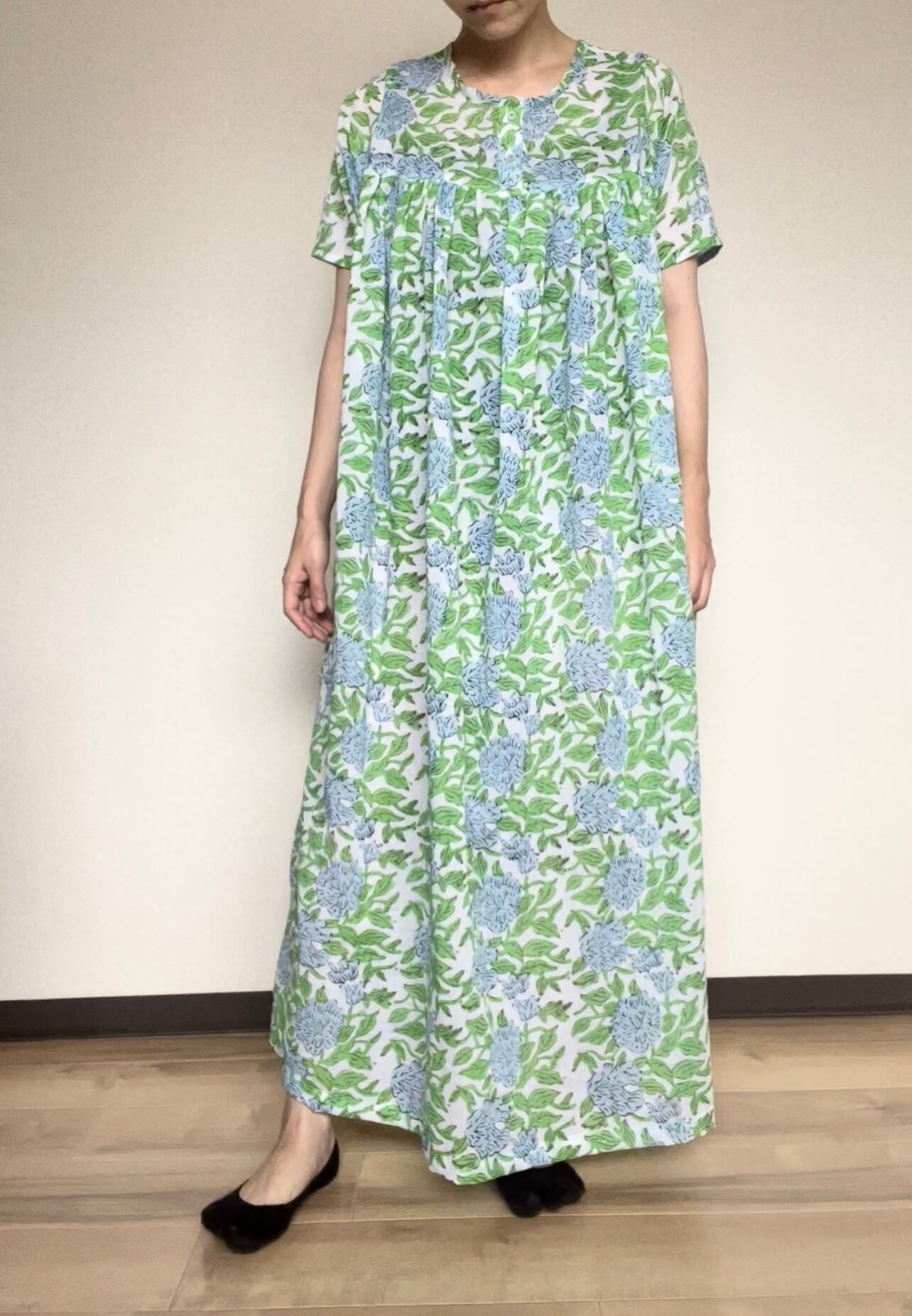 インドの室内着 ナイティ インド綿ブロックプリント(花柄グリーン)