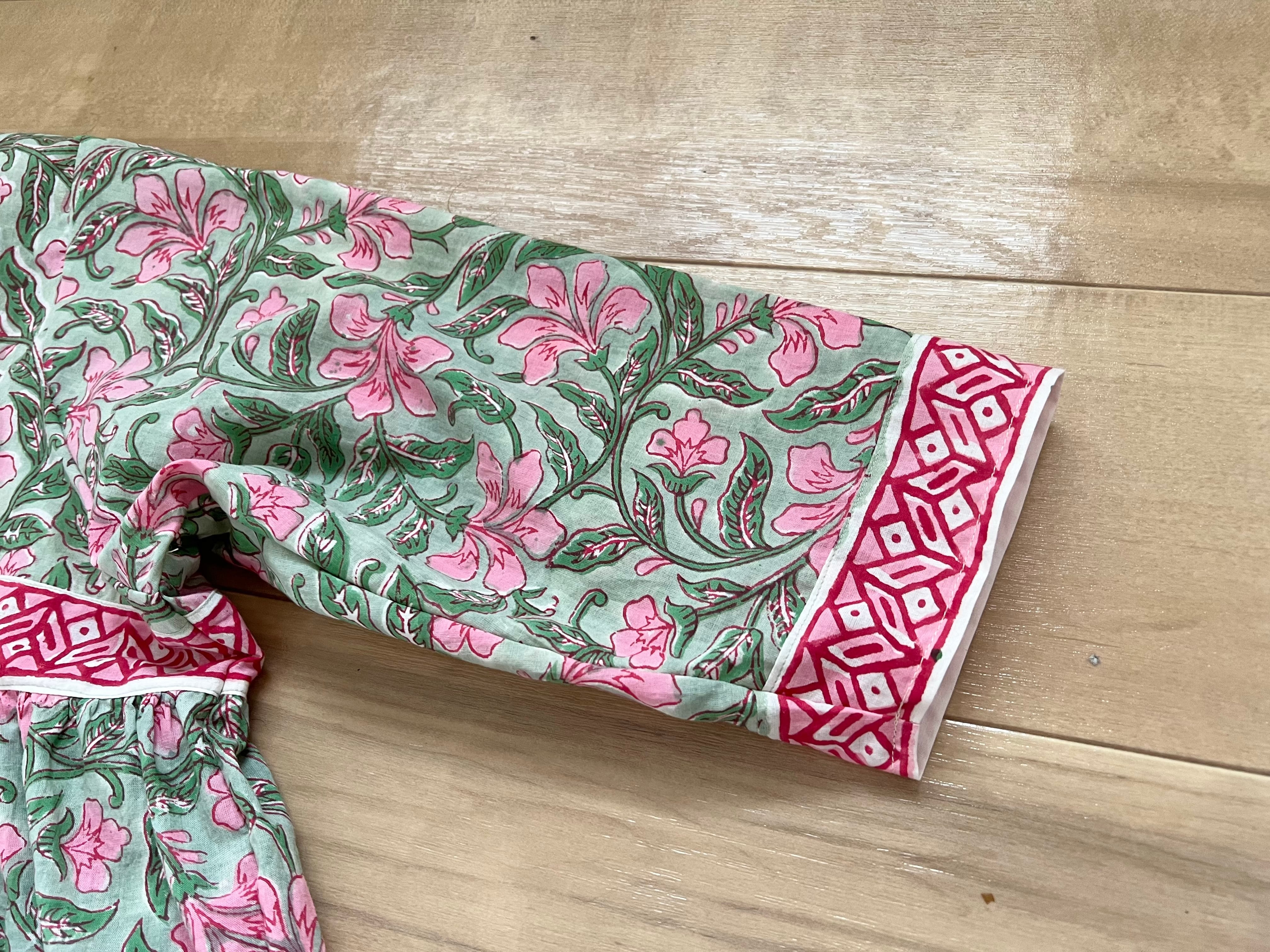 七分袖ワンピース インド綿ブロックプリント 花柄グリーン