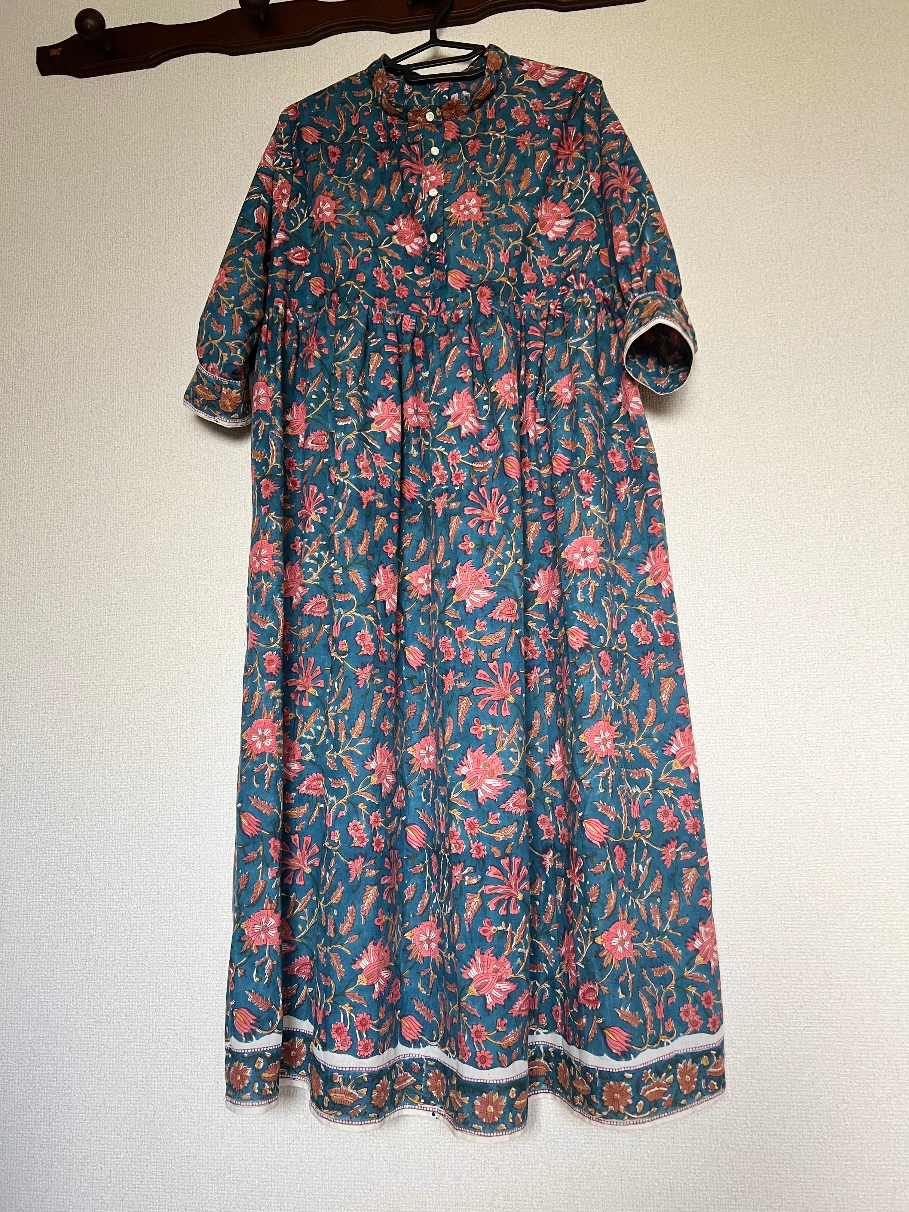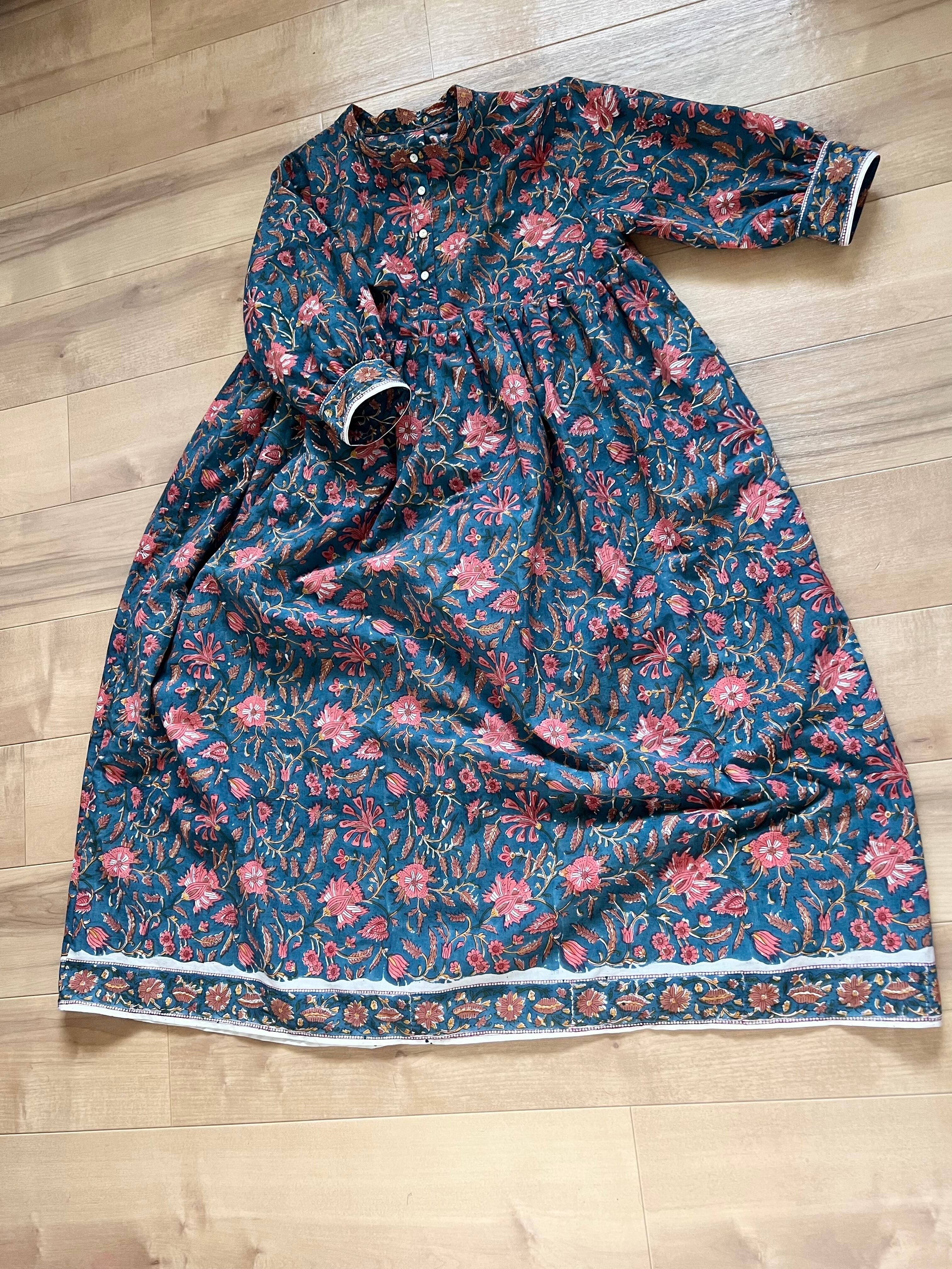 インド綿ワンピース 七分袖 ブロックプリント ネイビー×赤