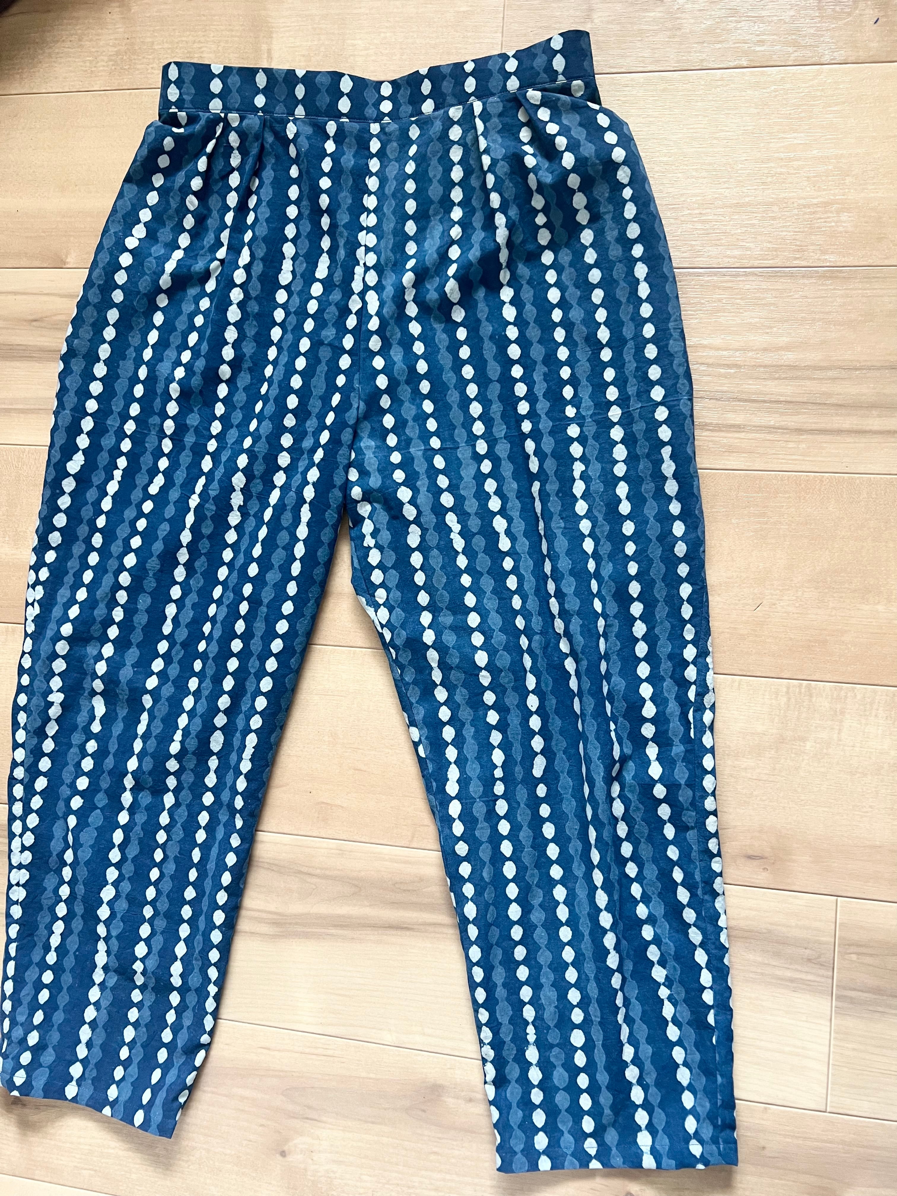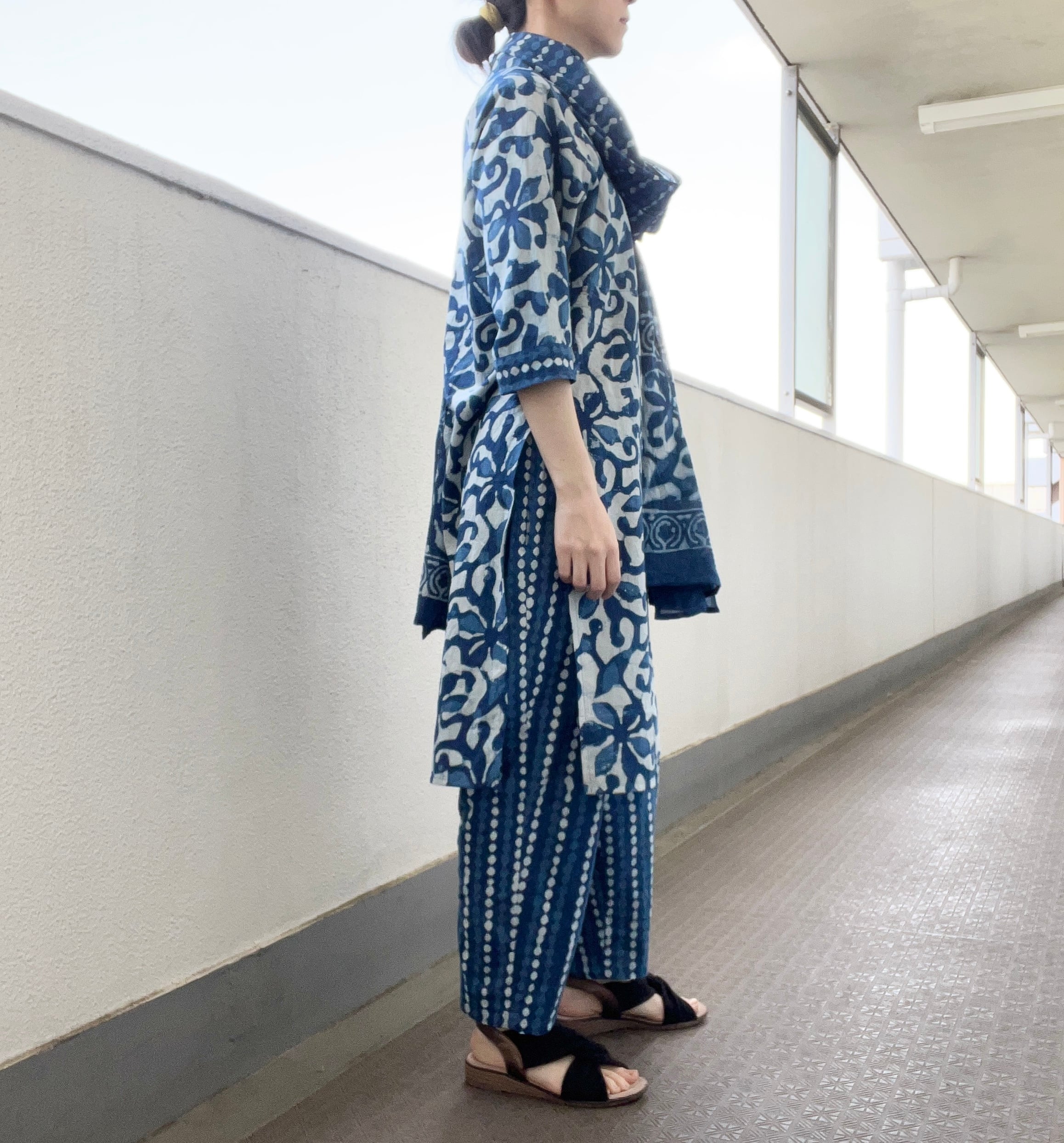 インド綿セットアップ⑤ パンジャビドレス ブロックプリント トップ パンツ ストール 3点セット ネイビー